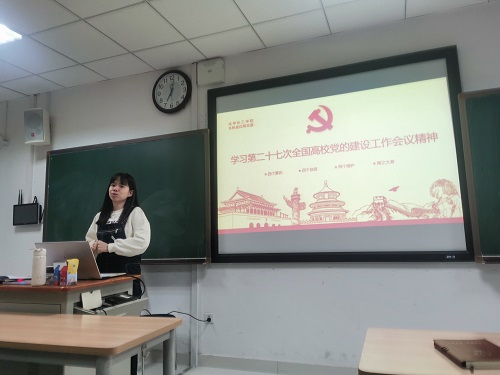 本科应化党支部于研究生院楼A202教室开展了对第27次全国党的建设工作会议精神的学习。由吴苑菲同志主讲,支部全体成员到课学习。