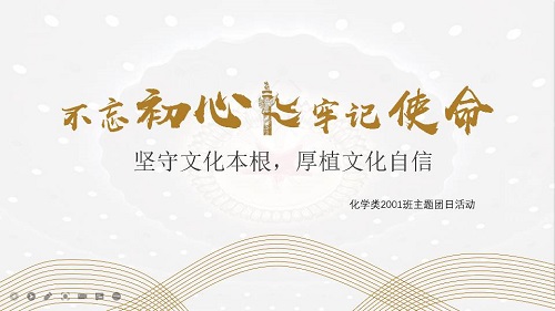 要求,于2021年11月10日在研究院楼B103召开了“坚守文化本根,厚植文化自信”主题团日活动。本次团日活动由团支书邹洋洋同学主持,化学2001班全员参加。
