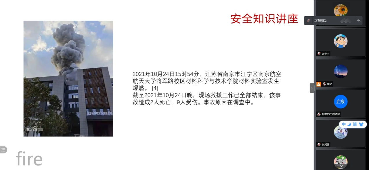 会议伊始,主持人金伟豪通过PPT的讲解向同学们介绍了易引发火灾的危险物品、火灾的类型、灭火方法及基本器具的使用。在这个过程中他多次向同学们强调要防范于未然、在生活中随时保持警惕,同时要注意多实践,掌握基本的灭火与逃生本领。而后,主持人结合本班专业,列举了几例实验室发生的消防事故。例如,2021年10月24日,江宁区将军大道29号南京航空航天大学将军路校区一实验室发生爆燃,共造成2人死亡,9人受伤;2018年12月26日北京交通大学市政环境工程系学生在玩偶姐姐