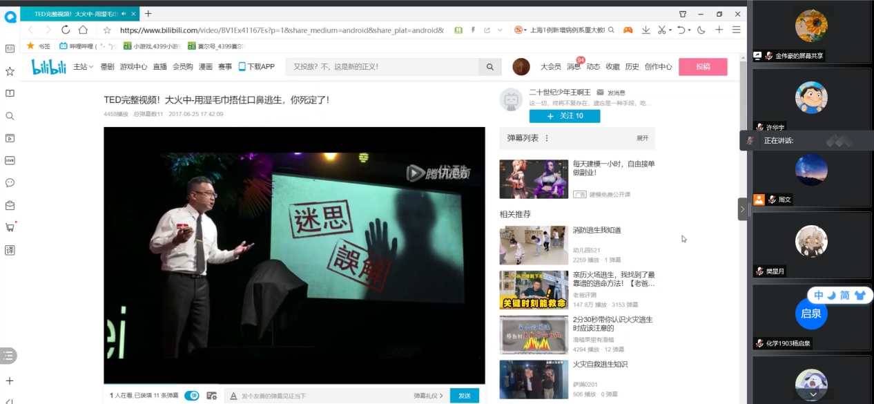 东校区2号楼环境工程实验室,进行垃圾渗滤液污水处理科研实验期间,实验现场发生爆炸,事故造成3名参与实验的学生死亡。消防事故的发生带走的不仅是财力和物力,还有科研人员宝贵的生命,这告诫同学们在科研过程中也要随时注意消防安全。在PPT讲解完毕后,主持人播放了一段演讲视频,视频讲解了在火灾发生时正确的逃生方法,以及正确逃生的重要性,纠正了同学们以往固化在思想中的错误逃生知识。