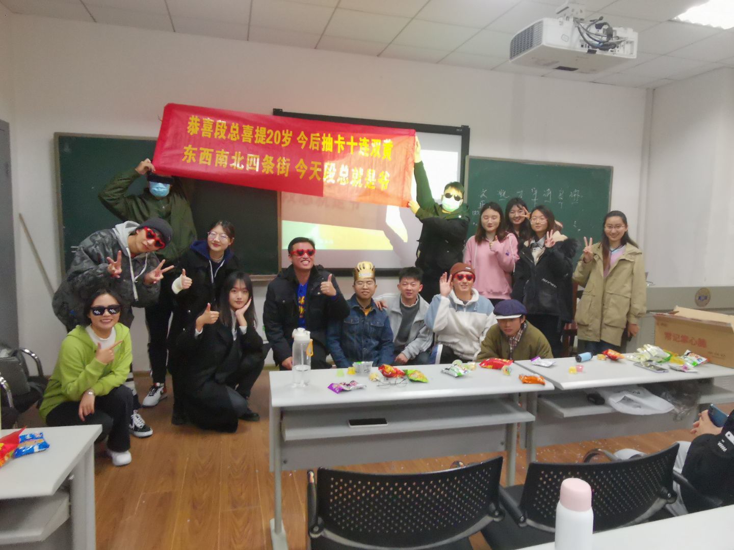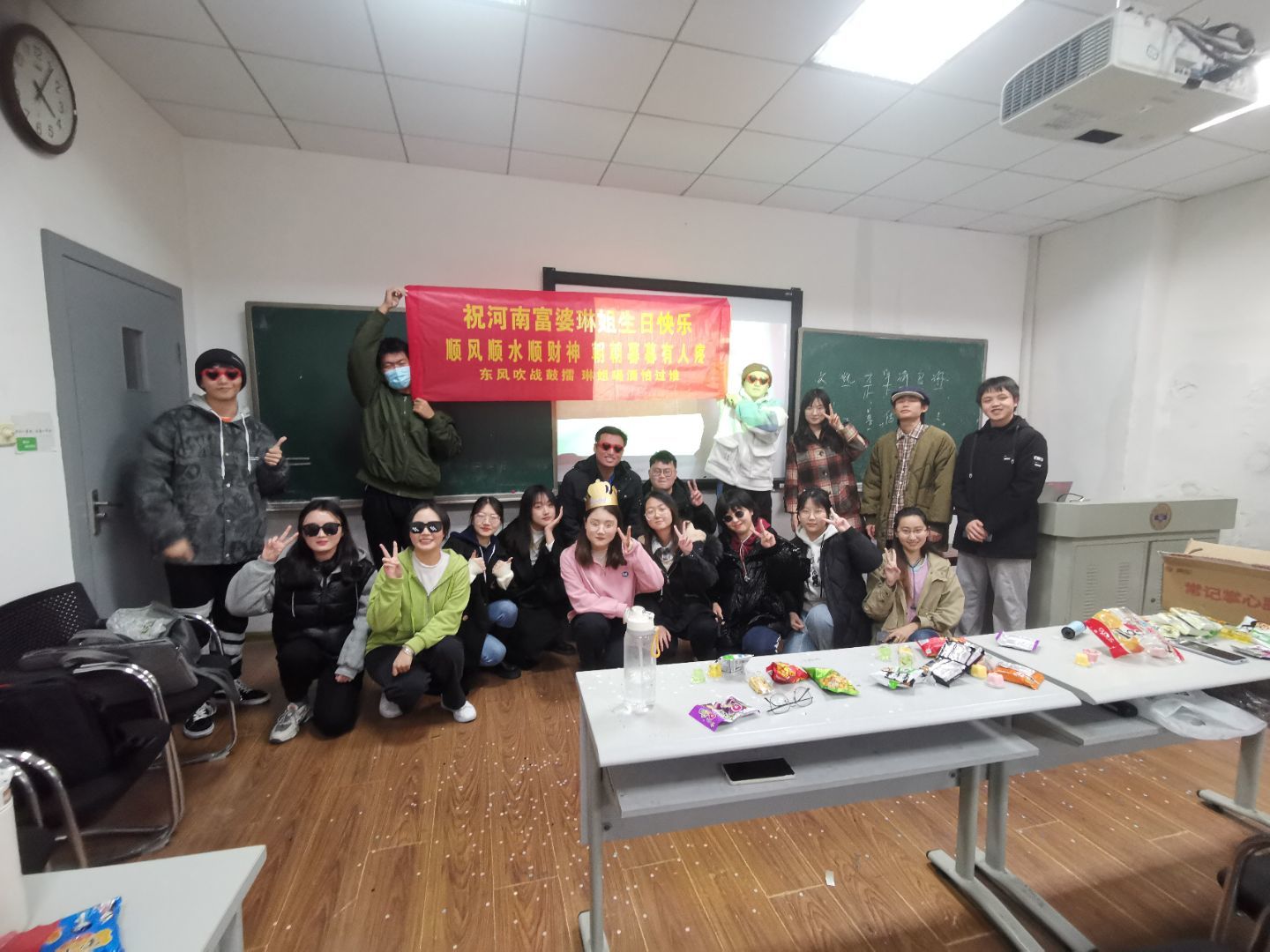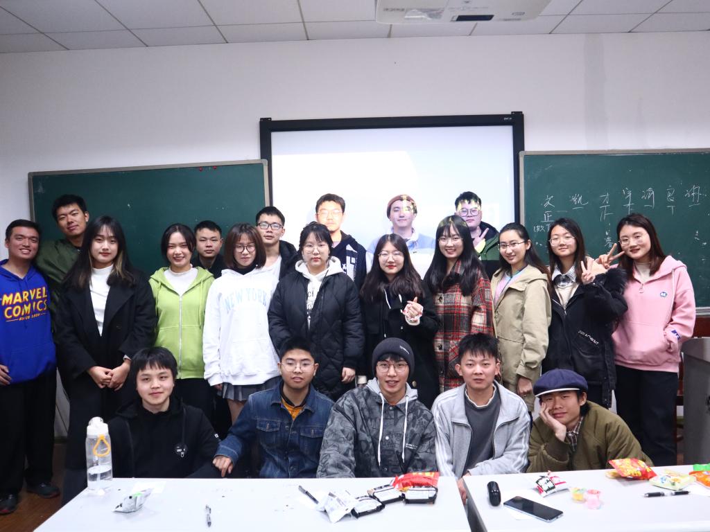下午四点整,心理团辅活动正式开始,每位同学的桌上都放好了提前准备的小零食。首先由班长李佳惠同学对本次心理团辅进行介绍,本次班会分为四个部分,分别是热身游戏,间休,我的前1/2和我的后1/2。热身游戏非常丰富有趣,包括了“抓蝴蝶”、“开关游戏”、“几匹马”、“接字游戏”、“我有你没有”、“抓青蛙”、“逛三园”、“闹钟炸弹”等,充分调动了同学们的积极性,在欢乐的氛围中放松同学们的心情。间休时,突然响起了敲门声,随即进来了刚刚表示要去洗手间的同学,他们拉开横幅,拧响礼炮,跟着音乐唱着“和所有的烦恼说拜拜……”,为班上当天和临近过生日的两位同学惊喜庆生,使全场的气氛更加高涨,并让同学们感受到了班级的欢乐与温暖。