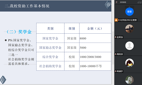 的资助工作情况进行了具体讲解。首先王雯雯同学从“奖”、“助”、“贷”、“勤”、“补”等五个方面介绍了玩偶姐姐