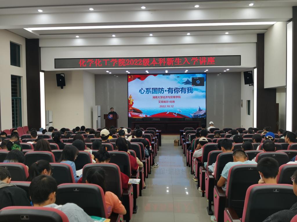 组织2022级本科新生于新化工楼D区报告厅参加“国防教育 征兵入伍”入学主题教育。艾克帕尔·吐地老师向同学们讲述了自己的从军经历和感受,并号召学生们踊跃参军,报效祖国。