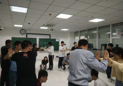 本次活动共分为4个环节。首先,主持人张海涛同学为大家简述了活动的主要目的,并开始了第一场游戏“蜈蚣翻身”。全班同学被分为2个小组,分两列纵队排好。全组同学手拉手连成一条“蜈蚣”。每组的第一位同学依次从两位同学的拉手处钻过去,第二位及之后的同学跟随前面的人一直钻完“孔处”。完成整个过程所用时间最少的组获胜。同学们明晰规则后便跃跃欲试,不断地尝试起来,经过几次失败后慢慢地找到了窍门。当主持人宣布比赛开始后,同学们以自己最快的速度进行着游戏,但第一组由于太过心急,出现了组员彼此“纠缠”在一起的现象,第二组则顺利的完成了游戏。尽管经历了一些意料不及的插曲,但两队组员间的手却紧紧牵在一起,所有小组都成功地完成了这一挑战。由于第二组的用时最长,由张海涛作为代表接受小惩罚,为大家唱了一首《当》,台下的同学连声叫好。