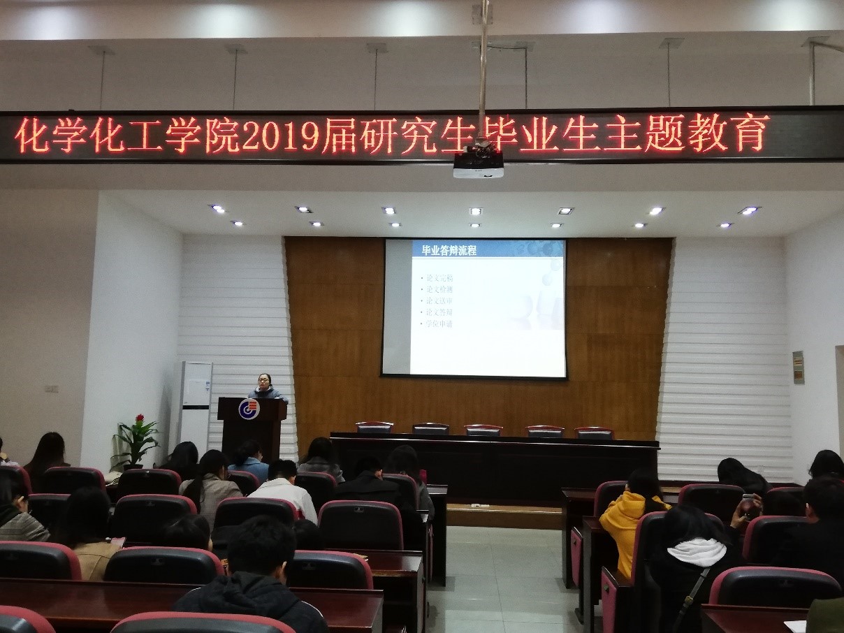 在新楼D区报告厅举行了研究生毕业生主题教育活动,该活动围绕“毕业答辩流程说明”、“毕业各类事项说明”两大主题展开,对研究生毕业相关事宜进行了说明介绍。参会人员主要有研究生秘书曾芳老师、研究生辅导员何妮翰老师以及全体19届研究生毕业生。