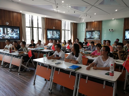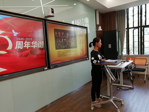 活动分为上午下午两场。9月28日上午10:30,全体同学到场后,新闻宣传委员组织大家观看《建国大业》影片。405教室四面环绕8块电子屏幕,课桌周围插有国旗,图片、实物和立体的声音使同学们更好地沉浸于对建国伟业的学习之中。电影放映结束后,同学们进行自由的回顾与思考。