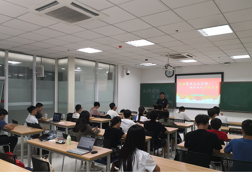 接着,团支书文佳林同学以“扬民族精神”为主题开始了发言。他从即将上映为祖国庆寿的电影《我和我的祖国》入手,为大家播放电影预告片。预告片里面人物所展现的对祖国的热爱,所诠释的民族精神震撼着同学们。同学们重温了祖国七十年来走过的风风雨雨、取得的辉煌成就,更加深刻地意识到了身体里的热血为祖国而滚烫。