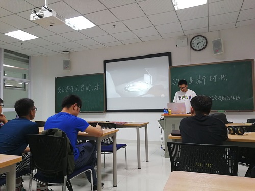 太阳微微下山,下午19时活动正式开始。活动第一项是欣赏爱国歌曲《祖国》,这首富有美好寓意的歌曲为整个团日活动营造了浓厚的爱国气氛,让大家在活动之初便明确了本次团日活动的意义。歌曲结束后,石家豪同学为班级同学介绍了黄大年,王硕威等优秀前辈的故事,以激励大家向前辈们学习,这两位令人敬佩的前辈均是为新中国建设做出了卓越贡献的人民英雄。活动的第三项为观看纪录片《他们正在改变中国》。这部令人震撼的纪录片,使同学们了解了许多成功企业家创业背后的心路历程。这部纪录片让同学们在更加广阔的视野下见证了国家的发展,深刻的认识到自己身上担负的时代重任。观看结束后,在团支书石家豪同学的带领下,大家集体重温入团誓言,这一过程让大家深刻的意识到自己身上的责任与使命。