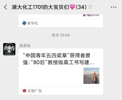 随后,同学们在班群里分享了第24届中国青年五四奖章评选中获奖人员的先进事迹,有抗疫一线的冲锋者,有脱贫攻坚的践行者,有用于拼搏的奋斗者……同学们纷纷表达了对这些优秀青年的钦佩之情,同时也激励自己奋发向上,争做有责任、有担当的新青年。