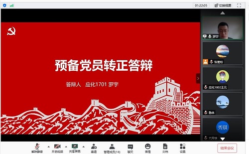 受疫情影响,本学期本科应化党支部预备党员无法返校开展转正答辩。在支部副书记张寒松的组织下,6月2日下午三点整,本科应化党支部通过腾讯会议平台召开支部党员大会,讨论预备党员罗宇等六名同志的转正问题。