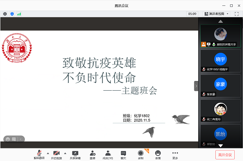 化学1802班通过腾讯会议,在线上开展了“致敬抗疫英雄,不负时代使命”主题班会。此次班会旨在宣扬抗疫精神,激励同学们肩负起新时代的使命。会议由班长顾悦主持,全体同学准时参加。