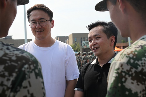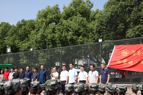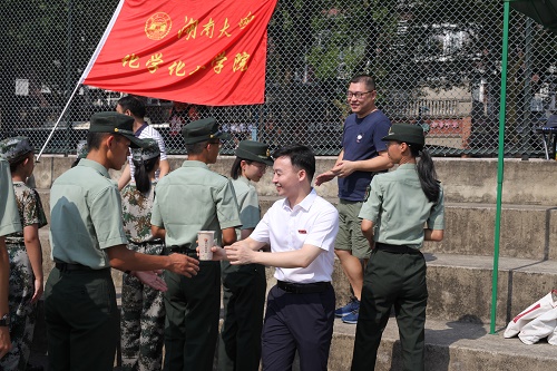 发表讲话,对全体新生、教官、班助们表示了关心慰问,鼓励新生们要坚持训练,努力战胜困难,随后与其他前来慰问的领导老师们一起为新生发放清凉奶茶,院党委副书记潘刚峰老师代表玩偶姐姐