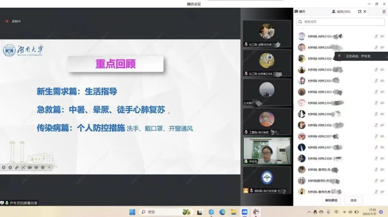 等多个院系联合举行,共三百名新生助理参会,培训内容主要围绕新生生活需求、急救及传染病的防护措施展开讲解,尹冬芳老师综合运用图文事例及视频,为大家生动讲述新生应当如何适应长沙的生活,如何使用医保、以及班助带领新生看病的流程。然后尹老师讲解了面对中暑晕厥以及扭伤如何急救,各种传染病及其相对应的防护措施,以提高新生助理的急救意识和自救互救能力,并解答了由新生助理提出的,如何帮助新同学快速适应新校园生活的各类问题。最后,尹老师谈到传染病一直是影响人们身体健康的重要因素,并强调关于传染病的早期筛查、接种疫苗、及时治疗等环节的必要性。如遇确诊新生,新生助理需要及时引导其就医以及做好相应的心理辅导。