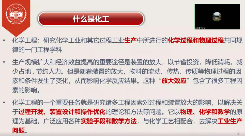 化工系主任王少飞教授向各位新生从概念区分、发展历史、能力要求、师资力量、实践教学平台、特色科研方向等方面使新生认识了化学工程与工艺专业。