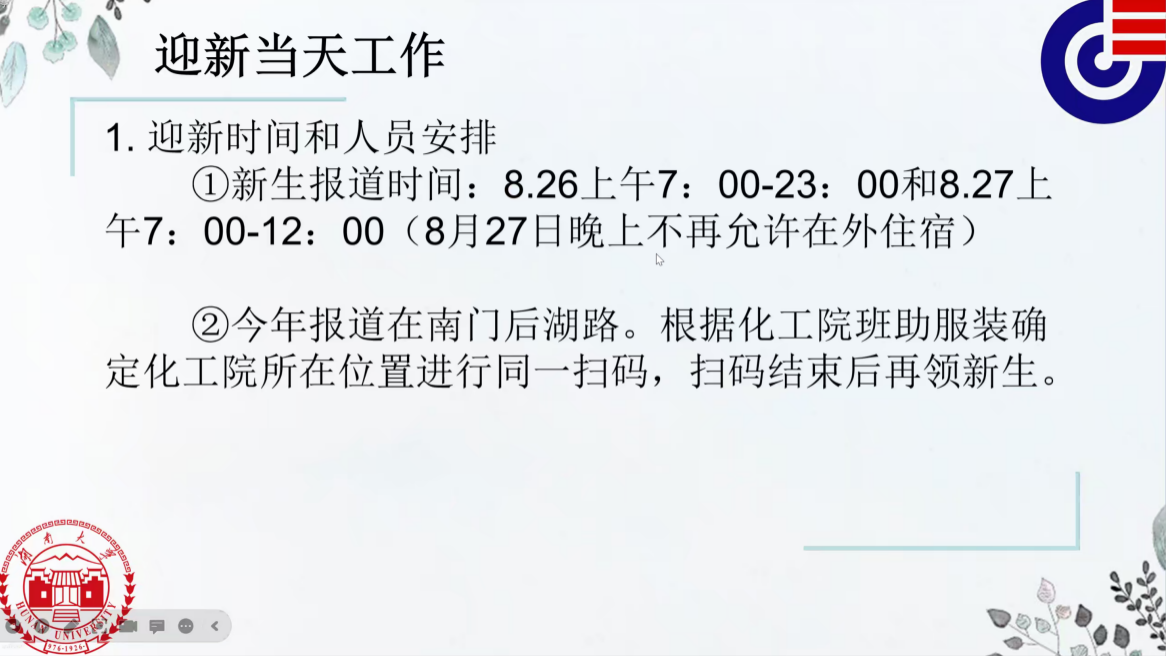 通过腾讯会议开展了新生志愿者线上培训会,旨在让迎新志愿者明确提前的踩点工作及迎新当天的工作安排。本次会议由化工院青志协部长、2023级迎新团队志愿者负责人胡梁榆同学主持。