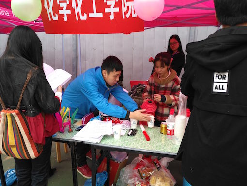 操场上的风渐大,却不敌志愿者们的热情。他们为每一位即将上场的运动员送上鼓励,一封封来自化工院的“情书”。当他们打开志愿者给的纸条,看到上面写着“为化工院战斗的你是最棒的”,都露出自信的笑容,志愿者们也收获了属于他们的温暖。天气转凉飘着小雨,细心周到的志愿者们还带来了姜汤,时刻叮嘱运动员们趁热喝下,一股热气在工作篷中散开,化工院志愿者们的荧光更显温暖,运动健儿带着志愿者的期望在运动场上尽显风采。