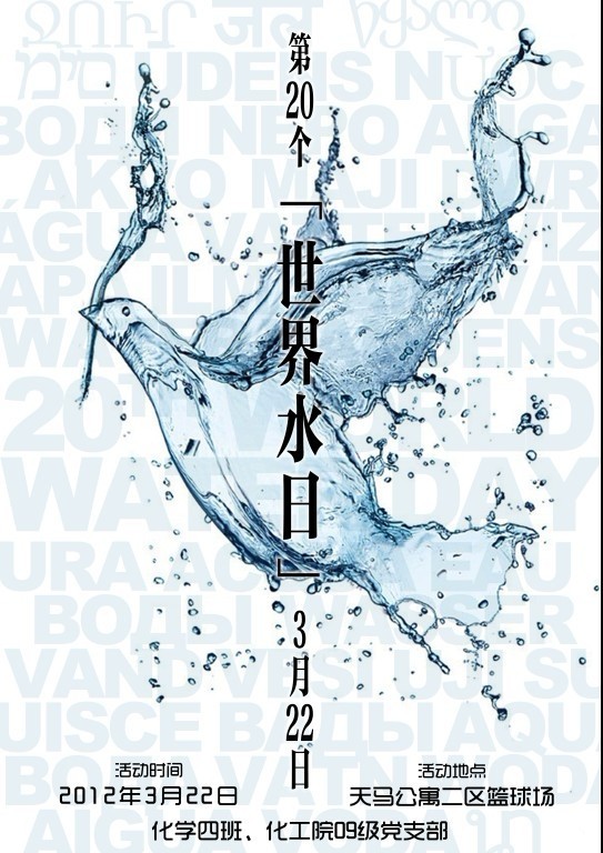 2012年3月22日是第20个世界节水日。水是一切生命赖以生存,社会经济发展不可缺少和不可替代的重要自然资源和环境要素。但是,现代社会的人口增长、工农业生产活动和城市化的急剧发展,对有限的水资源及水环境产生了巨大的冲击。在全球范围内,水质的污染、需水量的迅速增加以及部门间竞争性开发所导致的不合理利用,使水资源进一步短缺,水环境更加恶化,严重地影响了社会经济的发展,威胁着人类的福祉。如果不珍惜水资源,最后一滴水将是人类的眼泪。所以,我们要倡导节约观念,建设文明玩偶姐姐