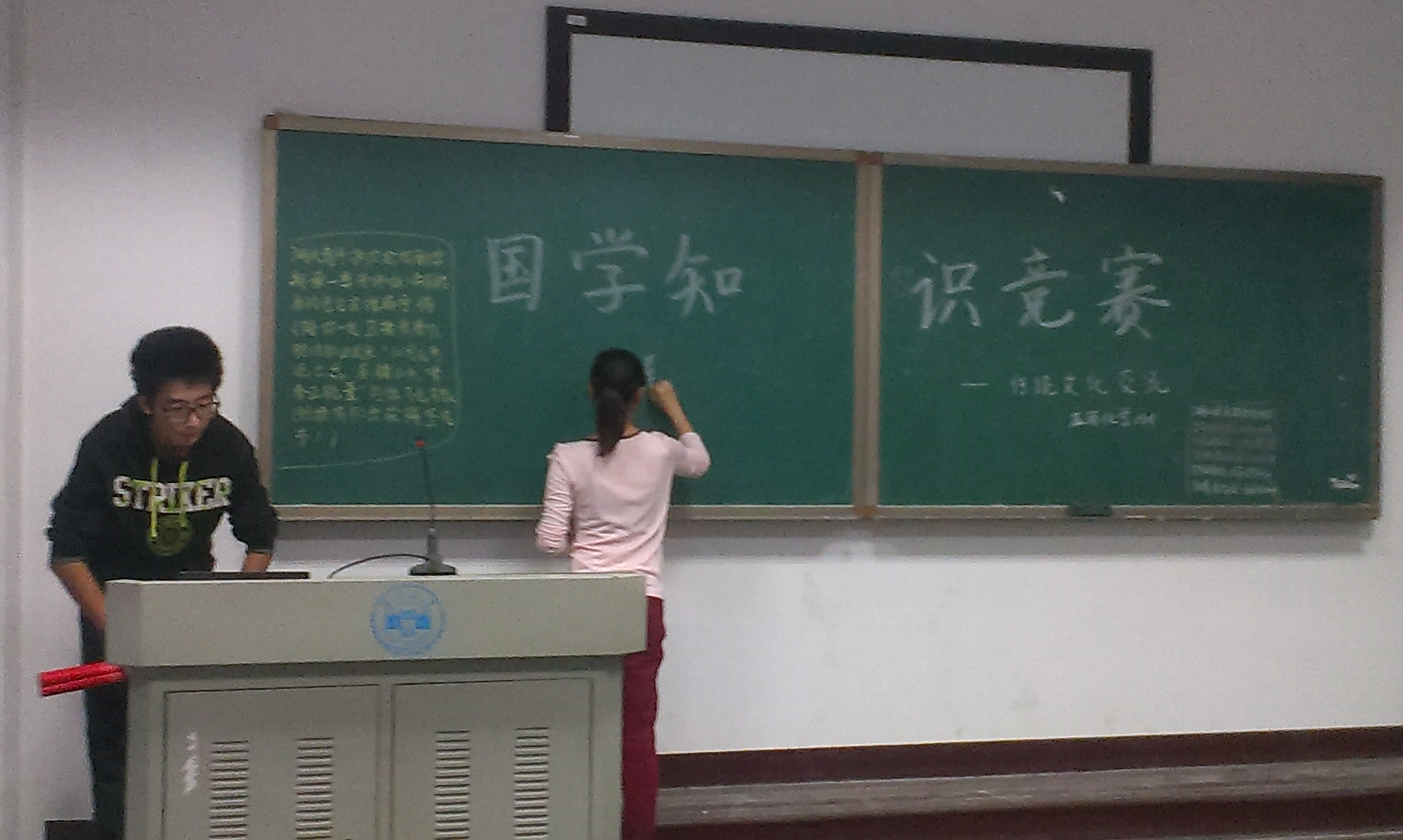 该活动分为两部分。首先,班级团支书以PPT的形式,向同学们普及了社会主义核心价值观,期间穿插了提问环节与抢答环节!同学们积极踊跃地参与其中并回答团支书提出的问题。紧接着,活动进入第二部分——国学知识竞赛抢答。同学们仍然保持着高昂的兴致,各个跃跃欲试,积极参与抢答,现场气氛非常热烈。终于,国学知识竞赛在激烈而又紧张的抢答中结束!