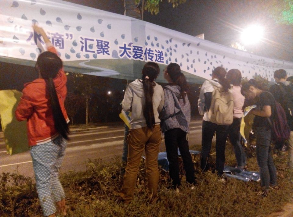 一直有人停下来看孩子们们绘画和志愿者们贴的水滴,公路上有不断的车穿行而过,志愿们和横幅被两旁的路灯投影在地上交错成一幅墨色的图画,志愿工作的时间总显得那么安宁和让人满足。因为感动和奉献而不断汇聚的水滴和志愿者们,正在为爱一路同行。