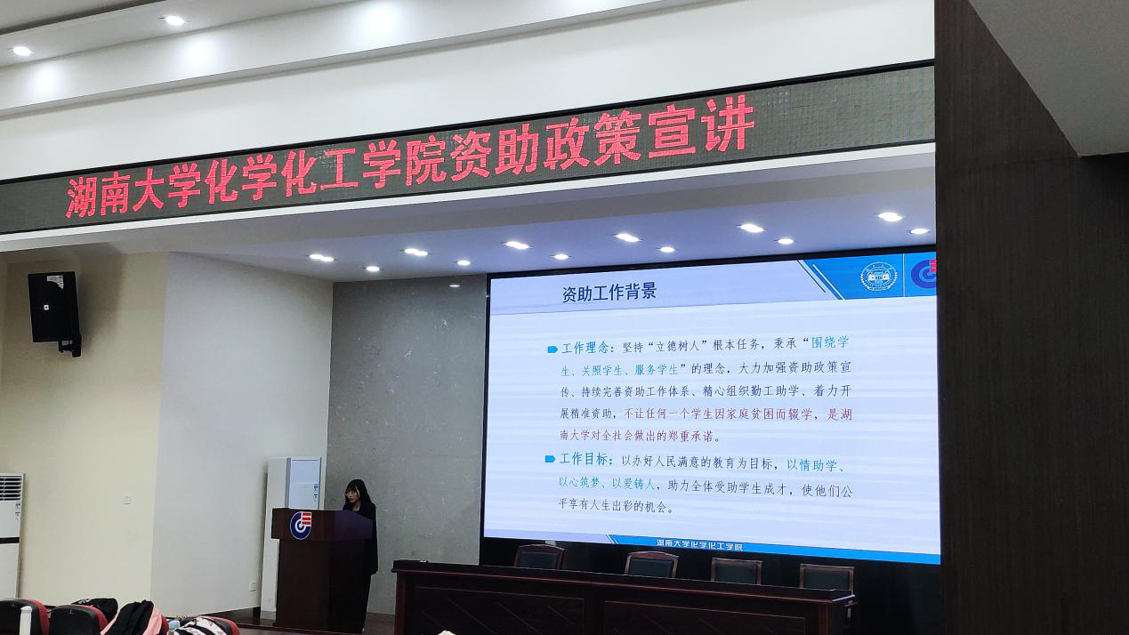 本次宣讲由资助兼干于哲老师主持,主要介绍了资助背景、资助工作基本情况和化工院特色资助工作三个板块,通过生动的数据和直观的图片反馈出玩偶姐姐