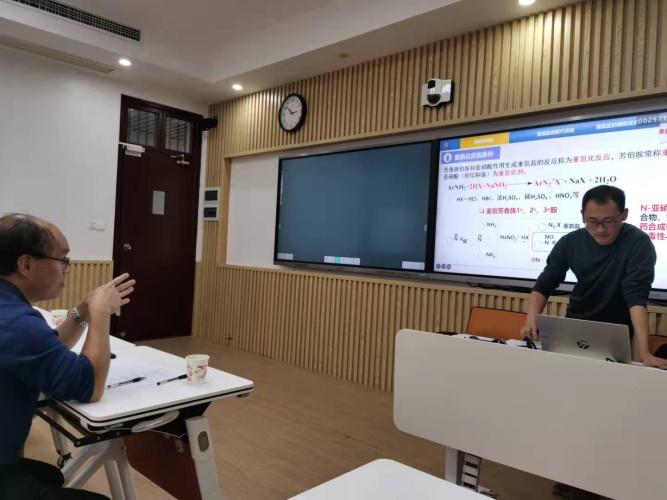 本次会议的主题为“重氮化合物的课堂教学听评课”,会议进行了三项议程。首先由汪兆丰教授做了15分钟内容详实的课堂教学示范。然后参会教师对如何进行教学设计进行了热烈的讨论。与会教师一致认为课堂教学设计应围绕教学目标展开,再依据教学目标整合教学内容并制定教学环节,鉴于课程的专业性,在教学环节一定要重视理论联系实际,多与生产、生活相联系。江国防教授对讨论内容进行了总结升华,并根据个人多年的教学经验,对教学内容的逻辑主线进行了重构,获得了参会教师的一致称赞。最后刘强教授对五维教学评价做了进一步解释并鼓励青年教师积极参加各项教学比赛。刘强教授还指出随着教学计划、教学模式的改变,应大力加强线上资源的利用。