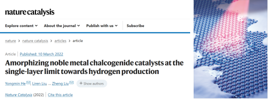 何勇民教授和新加坡南洋理工大学刘政教授、南京航空航天大学张助华教授团队合作,设计了单原子层贵金属催化剂,该研究成果以“Amorphizing noble metal chalcogenide catalysts at the single-layer limit towards hydrogen production”为题在线发表在《Nature Catalysis》,并入选三月杂志封面。