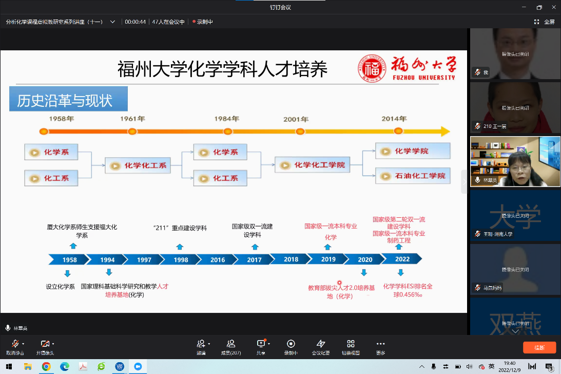 宦双燕教授主持,来自福州大学的林翠英老师为主讲嘉宾。林翠英老师是国家线上一流本科课程《分析化学》和福建省线上线下混合式一流课程《分析化学J》的课程负责人,她报告的题目是“思政融合的‘分析化学’混合式教学体系的探索”,参与本次虚拟教研室交流的有来自十余所高校的六十多位教师。林老师从福州大学化学学科人才培养、“分析化学”课程建设目标、混合式教学设计及实施、混合式教学成果四个方面做了详细报告。对“C3H3嘉锡教育理念”,即清醒的头脑(Clear Head),灵巧的双手(Clever Hands),整洁的习惯(Clean Habit)做了深入阐述,介绍了如何面向“C3H3”化学创新人才培养进行课程体系的建设,从基础知识、深度知识和广度知识三方面构建模块化知识体系,将线上教学资源融入线下教学过程管理中,将思政元素融入到教学内容中。教学中引入公共安全事件案例,培养学生的学科和专业使命感,同时让学生了解玩偶姐姐