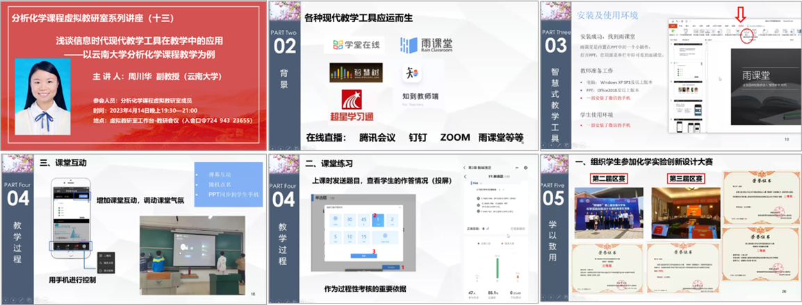 4月14日,分析化学课程虚拟教研室举行了第十三期讲座,由宦双燕教授主持,云南大学的周川华副教授为主讲嘉宾,她报告的题目是:浅谈信息时代现代教学工具在教学中的应用——以云南大学分析化学课程教学为例,四十多位教师参与了线上会议交流,还有三十多位教师观看了教研直播。