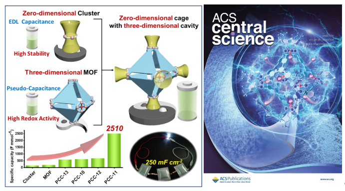 今年4月,方煜课题组通过一系列具有不同空腔的PCCs,研究了其作为柔性超级电容器的电化学行为和储能机制。这些PCCs表现出优异的电容器性能,其中锰基PCCs具有高达2514 F mmol-1的摩尔比电容、250 mF cm-2的高面电容和独特的循环稳定性。相关研究成果在国际知名期刊ACS Central Science(美国化学会中心科学)上发表,并被选为封面文章。方煜教授为论文单独通讯作者,玩偶姐姐