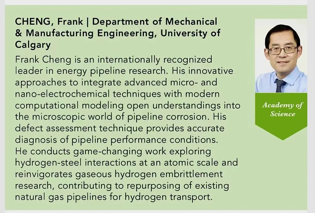 金属腐蚀与防护研究所(现金属所),1996年留学加拿大阿尔伯塔大学,1999年获材料工程博士学位。现任卡尔加里大学终身教授、先进材料与制造中心主任,为加拿大能源管道领域首席科学家、杰出材料科学家。目前主要从事氢气、二氧化碳和天然气管道的材料科学、电化学腐蚀与结构完整性研究。程玉峰以其在能源管道电化学腐蚀科学和材料科学领域做出的开创性研究成果以及巨大国际影响力当选加拿大皇家科玩偶姐姐