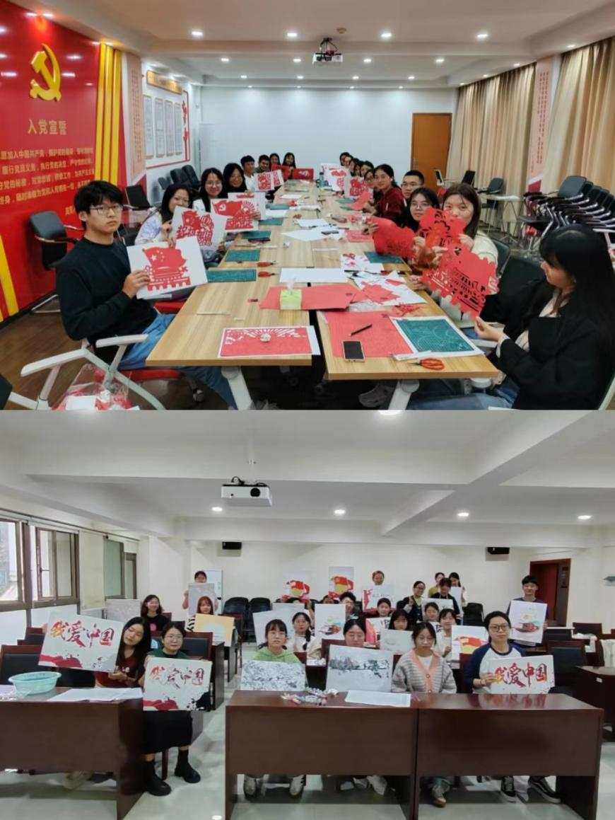 下午三点,参与剪纸活动的同学们在新化工楼D区党员活动室集合,大家有序地领取剪刀卡纸,耐心地描绘剪出一幅幅生动的剪纸作品。通过剪纸这种易于操作且具有传统文化特色的手工艺,加深同学们对于中国传统美育的理解和认知。红色剪纸不仅是中国传统文化中喜庆的元素,也包含着革命斗争和党建工作历史,既是传统艺术的植入,更是党员理想信念的植入。