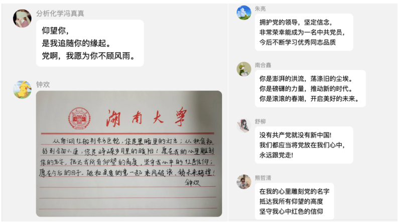分析06党支部精心开展“纸短情长,写给党的三行情书”主题党日活动,以三行情书的形式,书写对党的热爱和感恩,为党的生日献上美好祝福。此次活动以线上的方式开展,同学们根据要求在党支部群里完成作品的提交。支部成员热情响应,围绕深情回顾党的奋斗历史、热情讴歌党的光辉业绩、描绘祖国的大好河山、歌唱祖国的繁荣昌盛等内容进行了创作,并在群内依次分享了自己创作“三行情诗”。