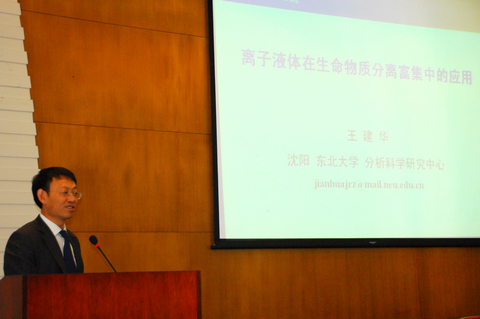 王建华教授首先向同学们介绍了东北大学分析科学研究中心的主要研究方向,并且指出样品预处理为研究中的瓶颈问题。他以人体中高低丰度蛋白质浓度的差异为切入点,指出低丰度蛋白质的准确定量的重要性,因此东北大学在传统方法用有机溶剂萃取蛋白质的基础上,选择尝试以离子液体来萃取。王教授以通俗易懂的语言,配加相应的PPT,力求让同学们更好地理解。