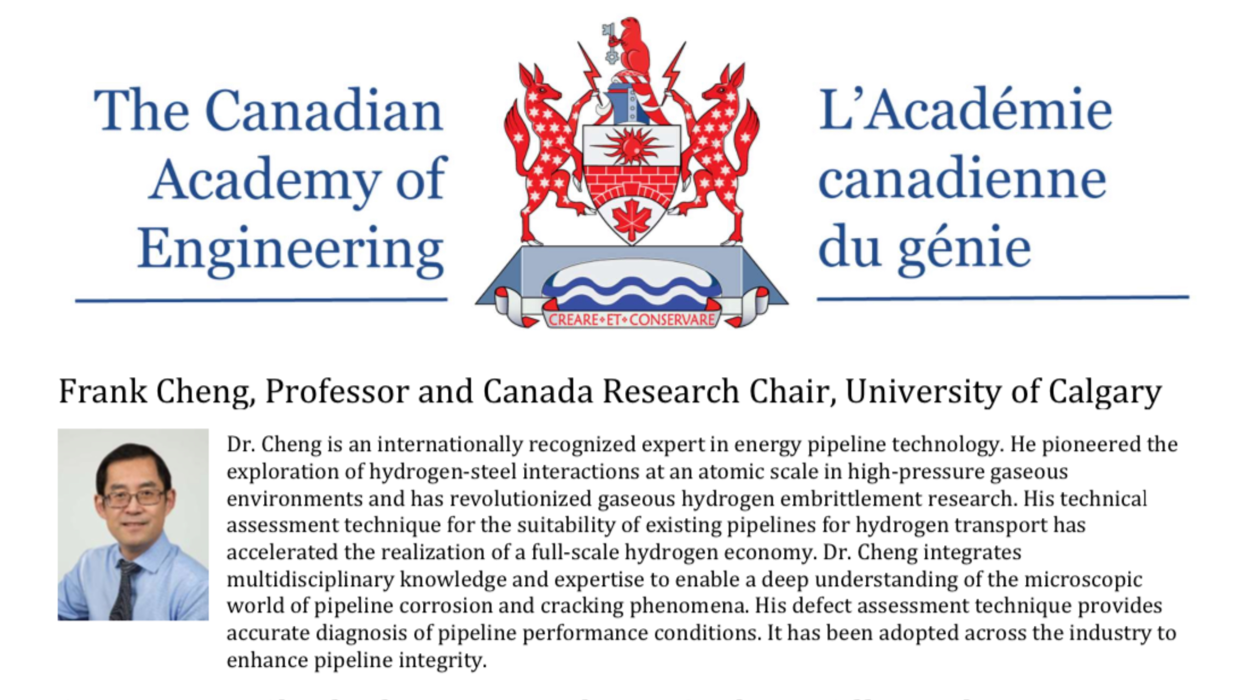 加拿大工程院成立于1987年,是世界26个国家工程院联盟会员之一。加拿大工程院院士是加拿大联邦政府授予在工程领域代表加拿大国家水平专家、教授的荣誉称号,并作为国家智囊团为国家层面课题立项、评审和研究提供权威意见。