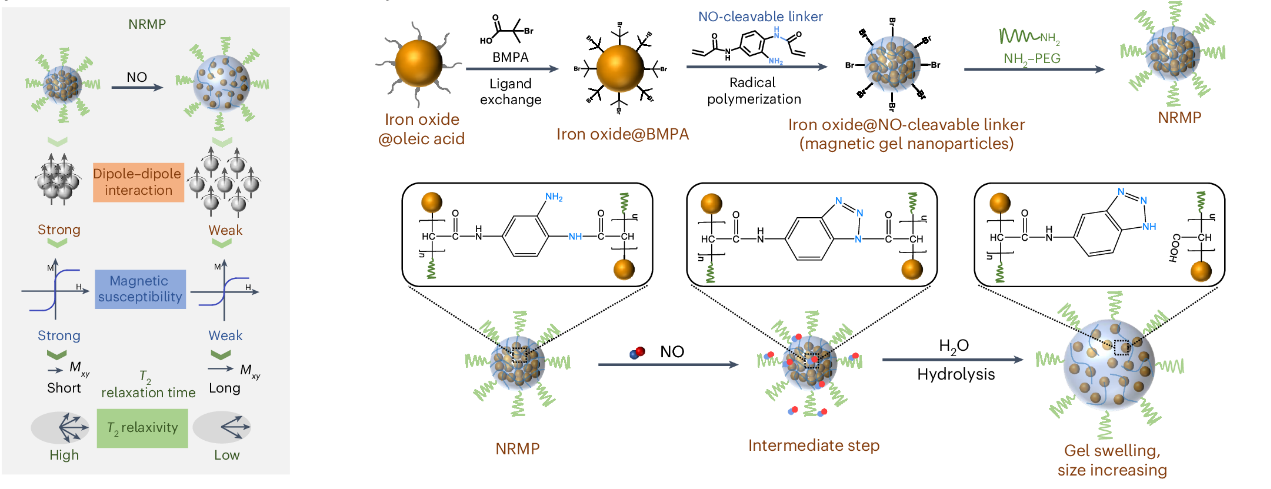 宋国胜教授和张晓兵教授团队成功开发出一种基于超顺磁性纳米颗粒的NO磁共振成像探针,通过NO切割反应调控纳米探针的磁化率及饱和磁化强度,从而实现NO的高灵敏度检测。该探针在NO的检测中显示出高特异性和抗干扰能力,同时能够感知NO浓度的微小变化,检测限为 0.147 μM,为在活体中准确定量NO的水平提供了可靠的技术支持。