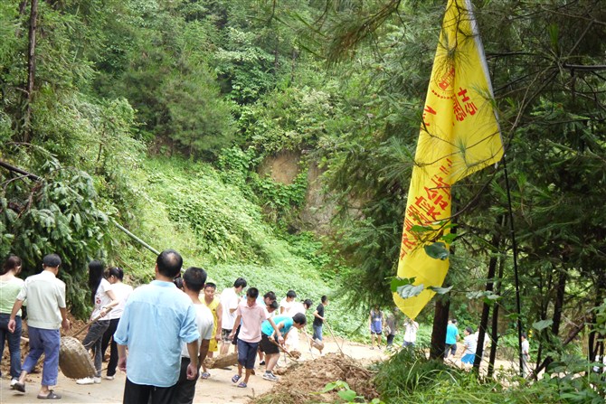 七江乡近期普降暴雨,降水量高达163.5mm,造成多处泥石流爆发。“三下乡”全体成员在达到目的地的第二天就投入到抗险救灾的活动中,清除由泥石流造成的堵塞路段。上午八点左右,在刘世明老师,陈晓晖老师的带领下来到了事故地点,投身到如火如荼的清扫工作中。当地干部为我们提供了清扫工具,开始同学们对工具使用不太熟练,再加上泥沙中掺杂了大量的树根、竹子等杂物,我们的进度极其缓慢。经过当地民众的指导,我们学会了如何使用工具,速度大大提高。七江乡的当地干部还热情的为我们提供了矿泉水和水果。十一点半,我们胜利完成了任务,并和当地人员合影留念。