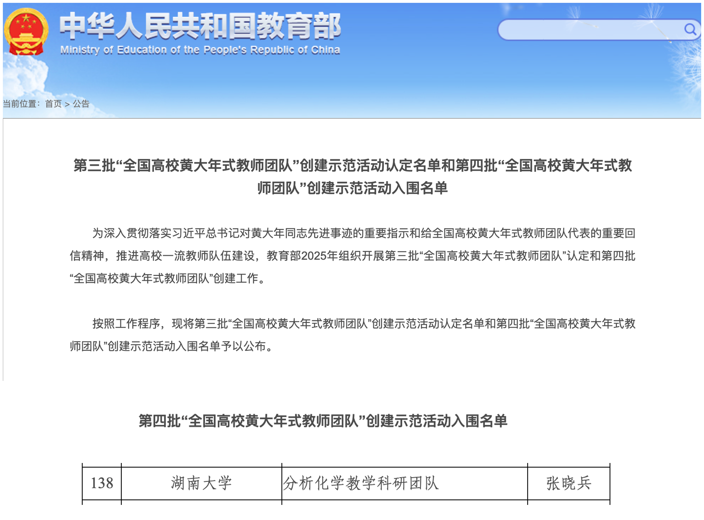 近日,教育部公布了第四批“全国高校黄大年式教师团队”入围名单,张晓兵教授领衔的分析化学教学科研团队成功入选。这是玩偶姐姐