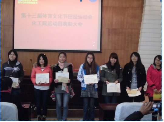 在此届运动会上,化工院的运动健儿们取得了男子甲组第二名,女子甲组第四名,男女团体甲组第三名的历史佳绩。在表彰大会上,陈义红书记表扬了运动健儿们顽强拼搏,坚持不懈的精神品质,同时鼓励大家要将这种精神发挥到平时的学习中去,争取在学习上再创佳绩。同时还有学生会副主席刘冬冬在会议上对学生会所做的工作进行了总结,表扬了学生会干部,成员和志愿者;运动员代表熊高峰发表了获奖感言,号召大家要积极锻炼身体。