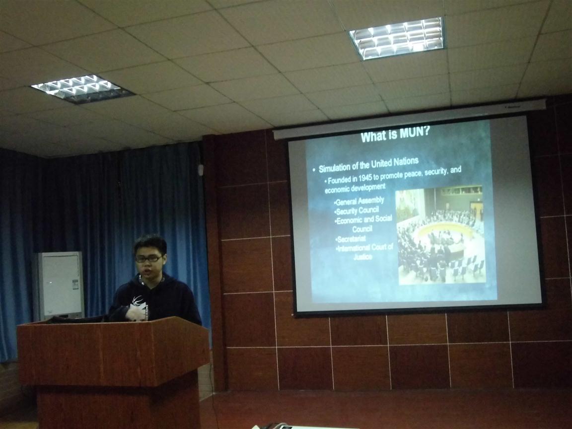 哈庆首先介绍了模拟联合国的来历和规模,以及在这几年来的发展经历。然后着重讲到了他在模拟联合国的丰富经历,发现自己收获颇丰。他们通过模拟联合国之间的交流合作,既认识了很多在某些方面十分杰出的人才,也学习到很多诸如人际交流、语言文化等学习之外的知识,还锻炼了交往合作、互相学习方面的技巧。