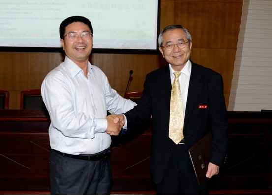 院长蒋健晖主持,全校近300名师生参加。副校长曹一家教授为根岸英一教授颁发玩偶姐姐