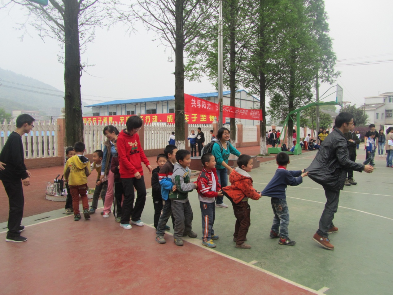 由30届分团委学生会第一副书记胡晨霞带领的8名志愿者被分成了4组,分别与4个年级的小学生互相结对。志愿者们热情地与孩子们交谈,快乐地教孩子们如何唱歌跳舞,并对小学生们进行了形体指导。胡姐姐以一曲“青藏高原”引爆了全场,逗得孩子们哈哈大笑。操场上回荡着孩子们的笑声,看着一张张天真无邪的面孔,志愿者们也露出了欣慰的笑容。通过这次活动,孩子们充分感受到了来自志愿者的温暖,而志愿者们也暂时抛开了繁重的课业,感受到了童真的快乐。