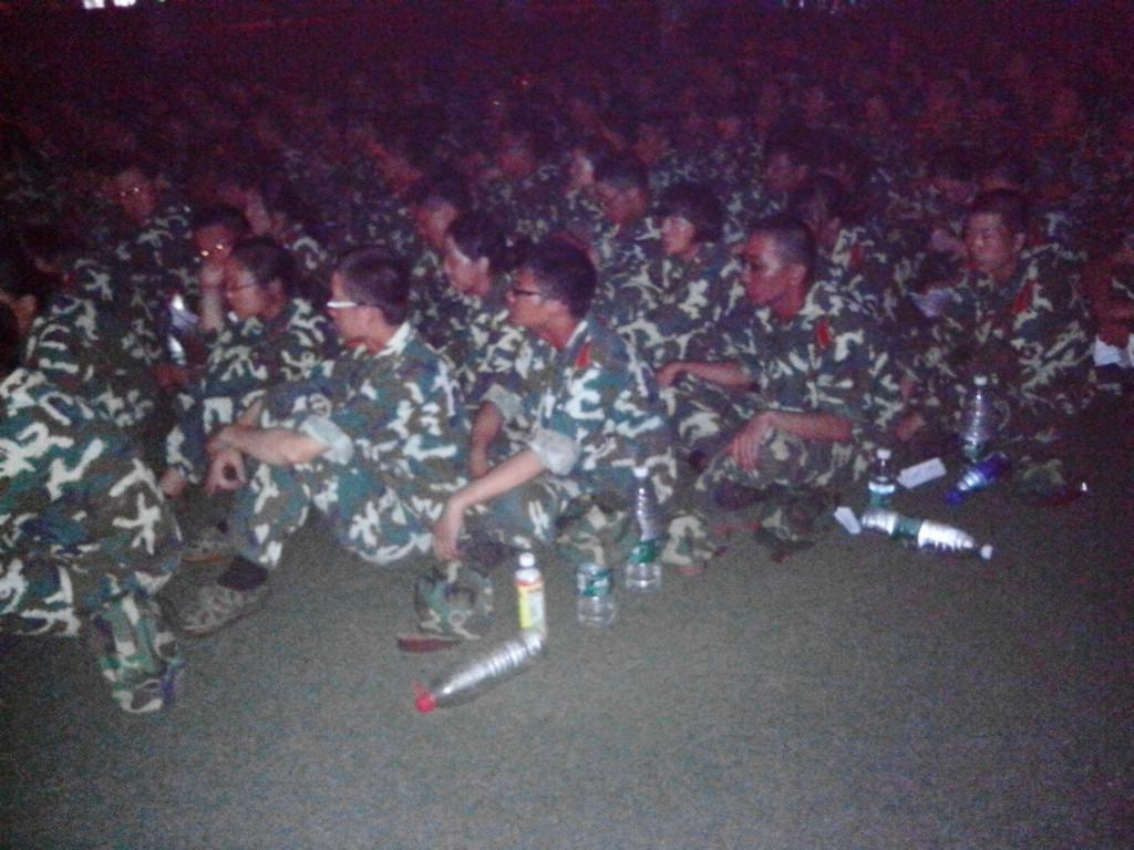 新生们大约下午五点半结束一天的训练之后,吃完晚饭稍作休息,六点五十在足球场集合完毕,然后在教官、学生会主席王意以及新生班主任的带领下一遍又一遍地练着军歌。