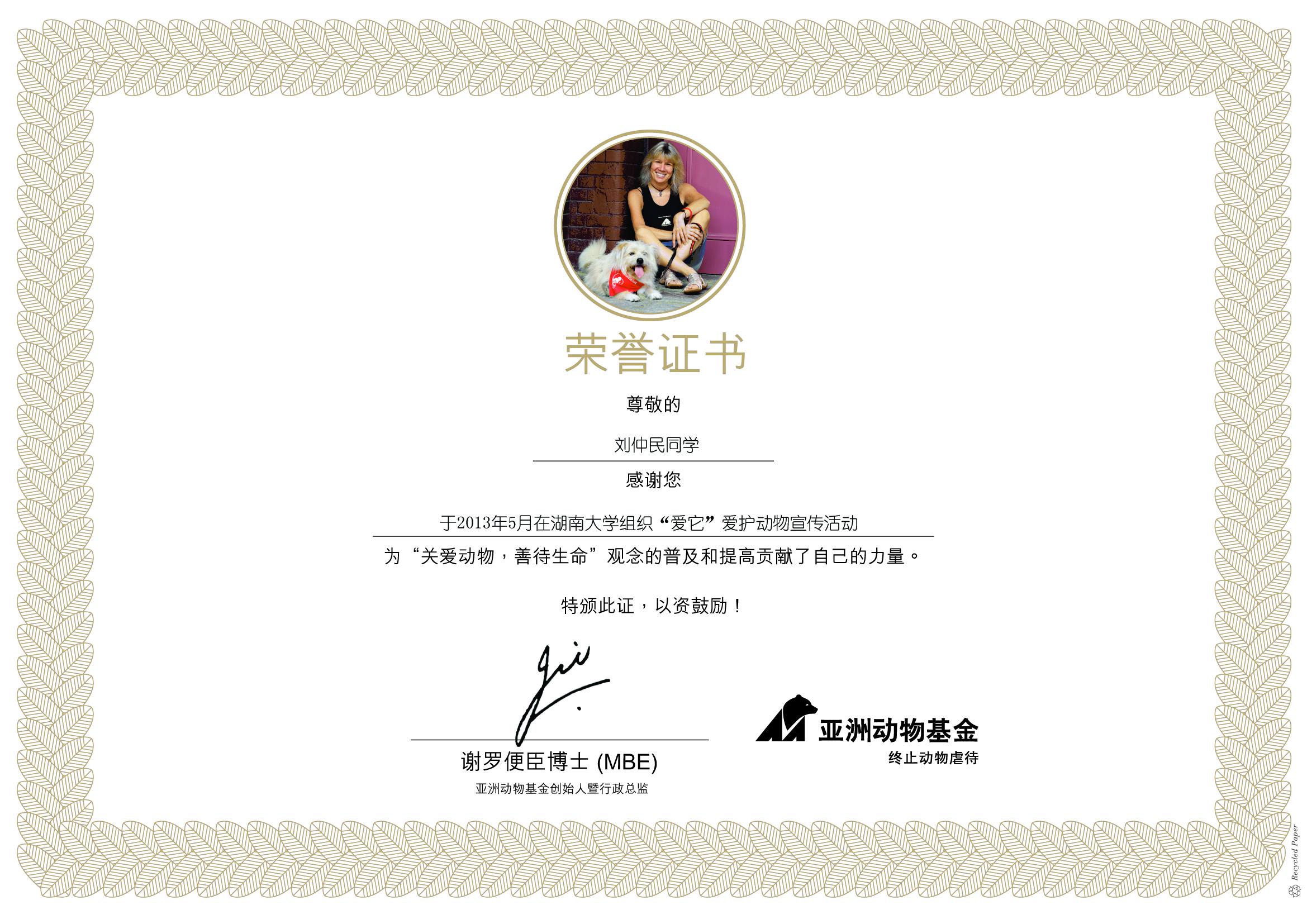 官网等校内外多家知名网站报导。近日,亚洲动物基金会发来了迟到的好消息,“爱它行动——拒吃猫狗”活动获得亚洲动物基金会“季度最佳活动奖”,活动组织者刘仲民同学同时获得“优秀个人奖”。