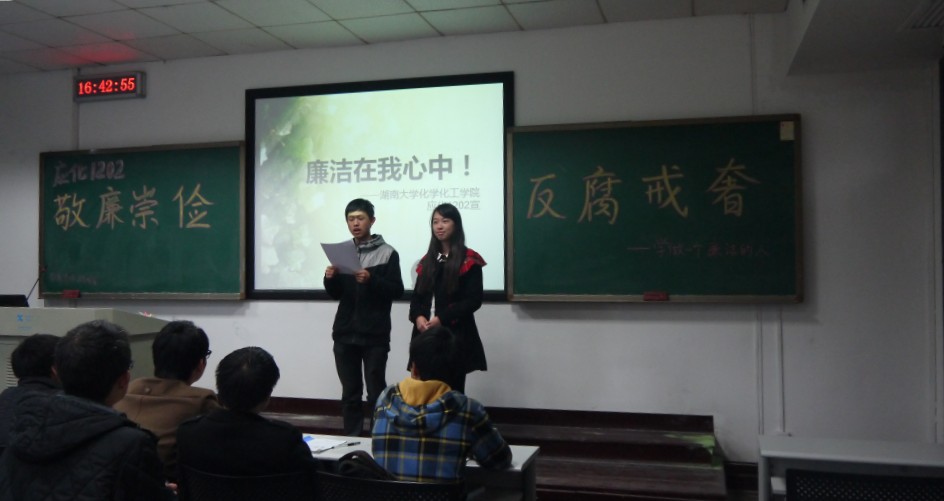 应用化学1202班全体同学在中楼203教室举行了以“敬廉崇俭,反腐戒奢”为主题的廉洁教育主题班会,由章凡凡和安坦同学主持。