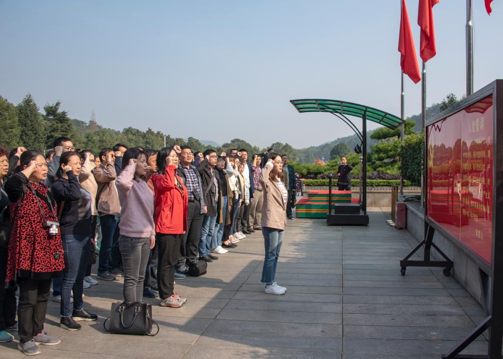 党委书记王玉枝和副书记范媛吉共同整理花篮上的缎带。接着,全体党员面对鲜红的党旗,在毛泽东同志铜像前重温了入党誓词,追寻和感悟“初心与使命”的深刻内涵。随后,大家逐一参观了韶山毛泽东同志纪念馆内的中国共产党成立、秋收起义、红军长征、抗日战争、建立新中国等展区,一张张图片、一段段历史,让大家体会到了主席波澜壮阔的一生。在毛主席故居,大家领略故居的秀美和岁月的记忆同时,了解主席成长历程和伟人家风传承,深刻理解“孩儿立志出乡关,学不成名誓不还”的雄心壮志和“为有牺牲多壮志,敢教日月换新天”的无私奉献精神。
