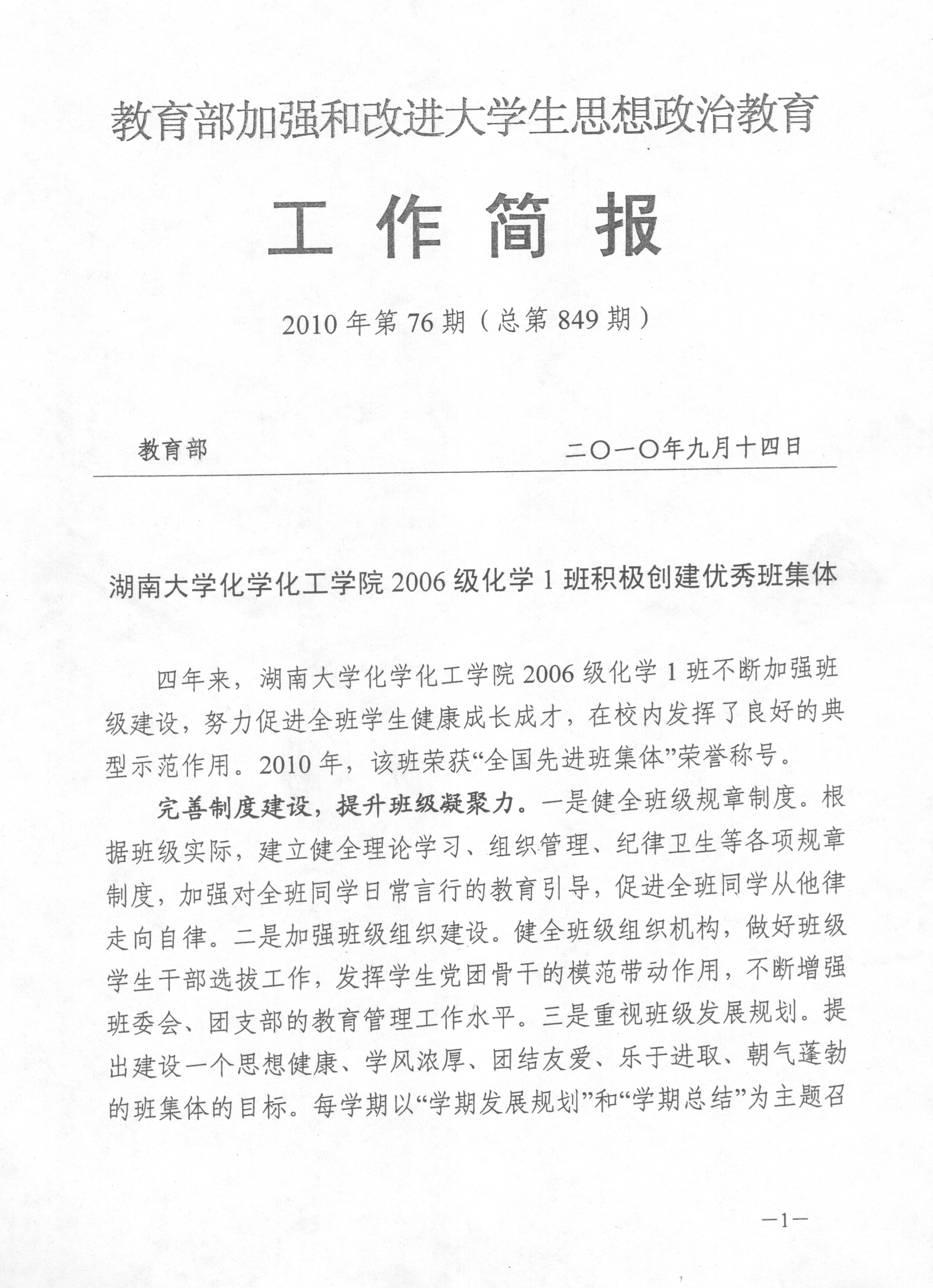 教育部工作简报:玩偶姐姐 2006级化学1班积极创建优秀班集体