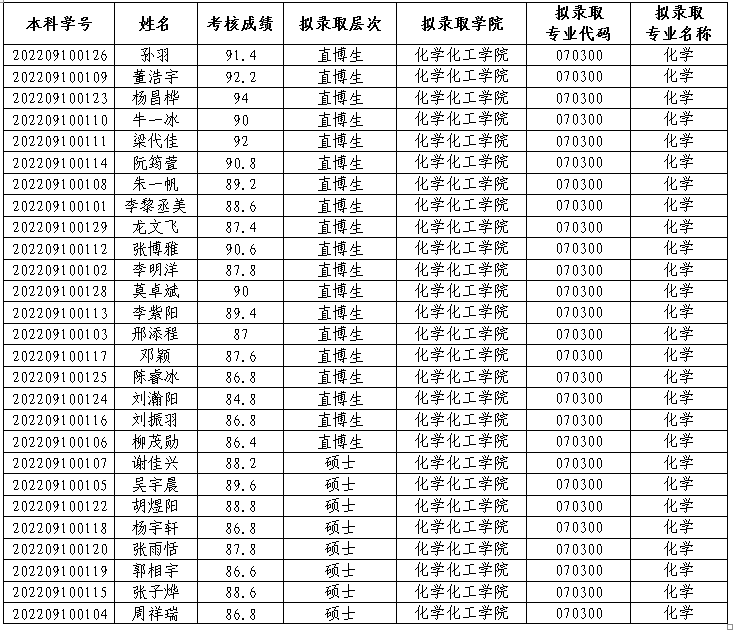 根据教育部及玩偶姐姐 关于“强基计划”学生转段研究生相关规定,经学生申请、玩偶姐姐 考核,现将玩偶姐姐 接收2022级“强基计划”学生本研转段考核结果予以公示,公示期为2025年9月24日-9月27日。如对拟录取名单有异议,请于公示期内向化学化工玩偶姐姐 书面反映。