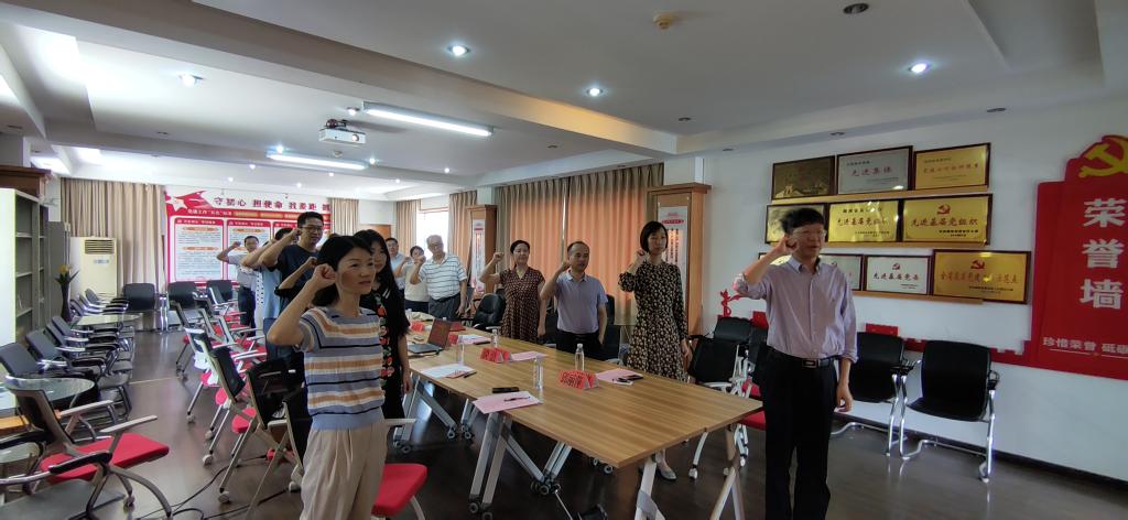 首先蒋健晖副校长带领大家重温入党誓词,进行庄严宣誓。之后宦双燕书记代表支委会向全体党员报告了半年来党支部工作情况,特别是开展党史学习教育情况,同时也通报了支委会检视问题情况。