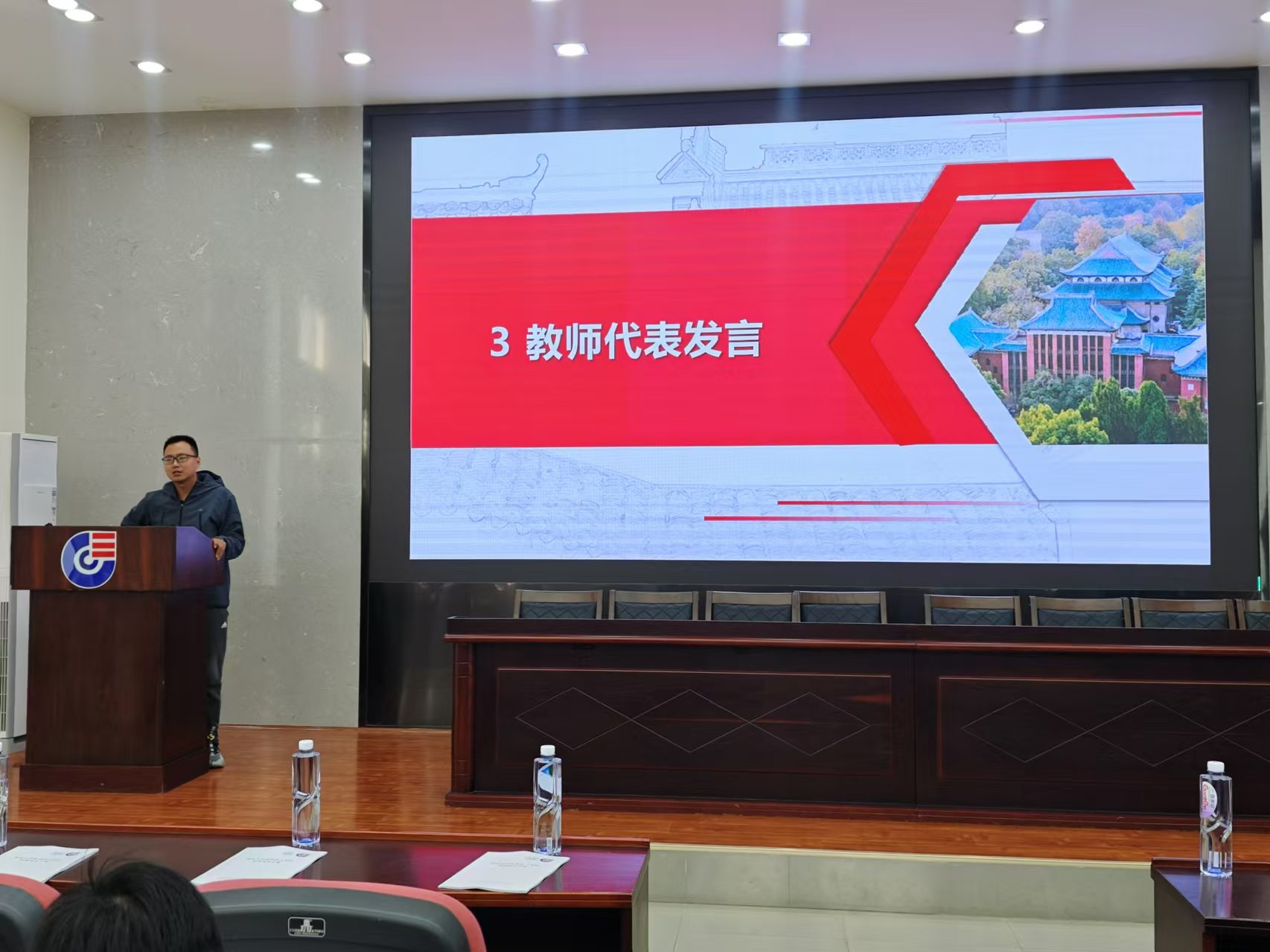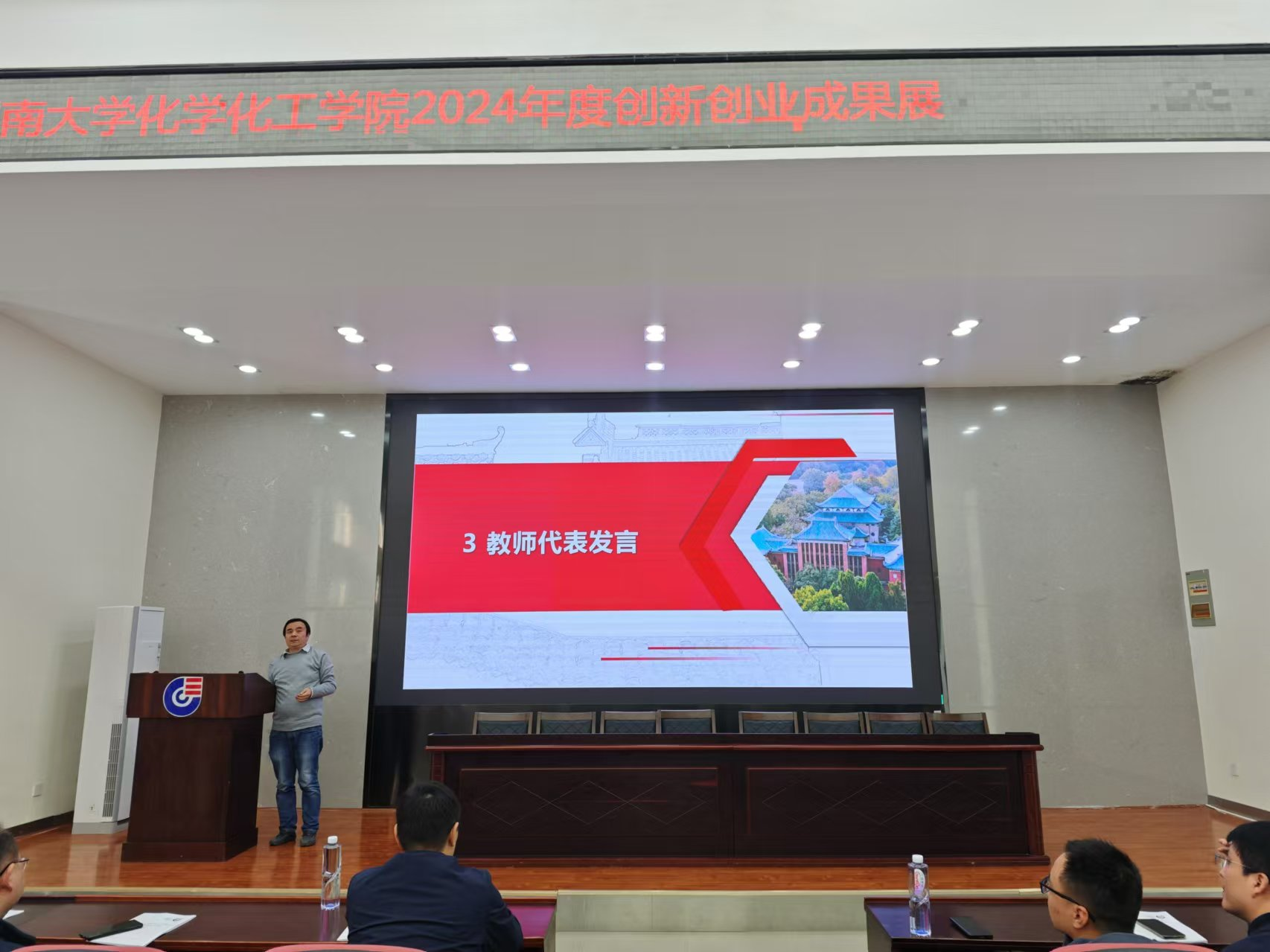 双创中心概况、近五年创新创业回顾、教师代表发言、学生代表发言、书记讲话等环节。