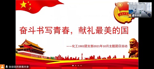2021年10月11日晚上九点半,化工1902班组织的“奋斗书写青春,献礼最美的国”主题团日活动以线上方式开展。2021年,时值中国共产党建党一百周年,中华人民共和国成立 72 周年,为进一步弘扬以爱国主义为核心的伟大民族精神,本班召开了主题团日活动,本次活动旨在不断强化思想、实践养成,切实汇聚广大团员爱国主义正能量。此次主题团日活动由团支书张徐丽主持,应到22人,实到21人。